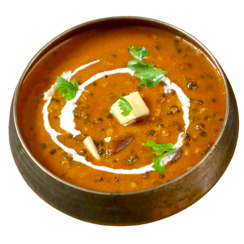 Dal Makhani is a rich North Indian dish made with slow-cooked whole black lentils simmered in butter and cream. The dish has a smooth texture and deep flavor developed through slow cooking.